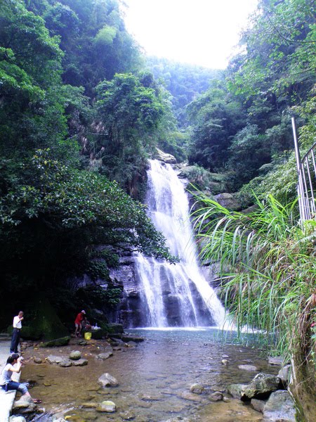 散花瀑布則是位在靈蛟瀑布的下游,雖然高度不高,但因水量充沛落下時激起大量的水花,有如天女散花般壯觀。